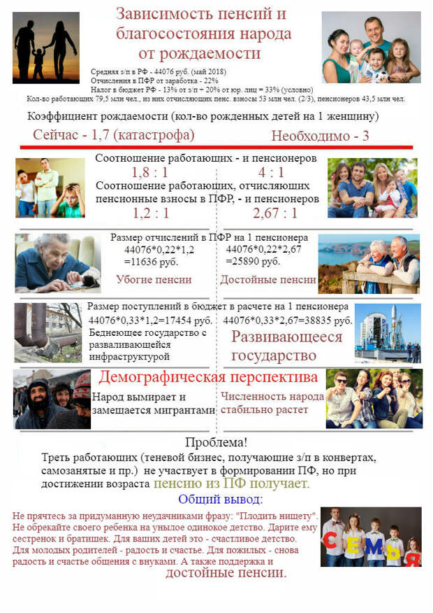 Проблема низких пенсий решается всем народом путем восстановления нормального уровня рождаемости. Восстановим нормальную смену поколений – восстановится сбалансированное соотношение работающих и пенсионеров. Наполнится пенсионный фонд. Повысятся размеры пенсий.